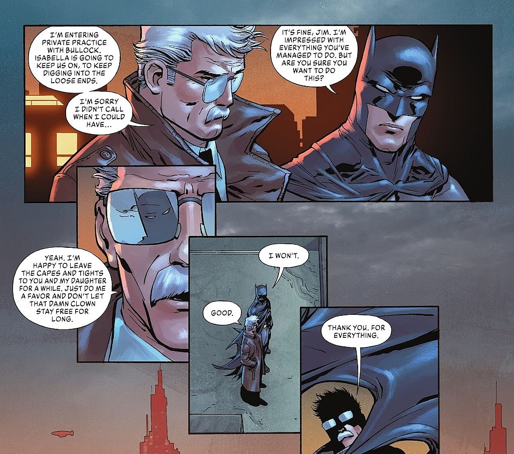 In Joker #15, the “series finale” of the saga, Jim tells Batman he is leaving the capes, villains, and soul-wrenching darkness of Gotham behind to partner with Harvey Bullock and become a private investigator.