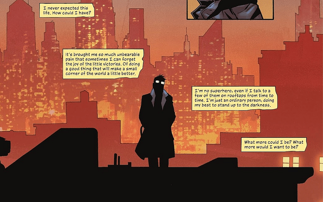 “I’m entering private practice with Bullock… I’m happy to leave the capes and tights to you and my daughter for a while. Just do me a favor and don’t let that damn clown stay free for long,” he says to Batman in a signature rooftop chat that may be their last.