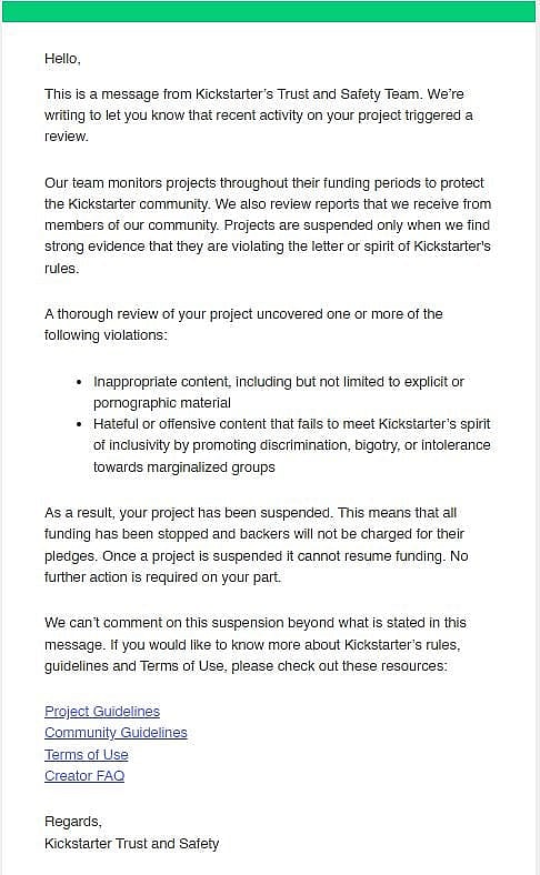 This is a message from Kickstarter’s Trust and Safety Team. We’re writing to let you know that recent activity on your project triggered a review.