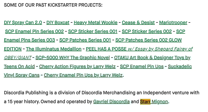 Braly’s reporting linked Gavriel Discordia to Starr Mignon as partners behind Discordia Culture Shop, the retail arm of Discordia Merchandising. The two are also currently crowdfunding their own graphic novel SCP-5000 through Kickstarter.