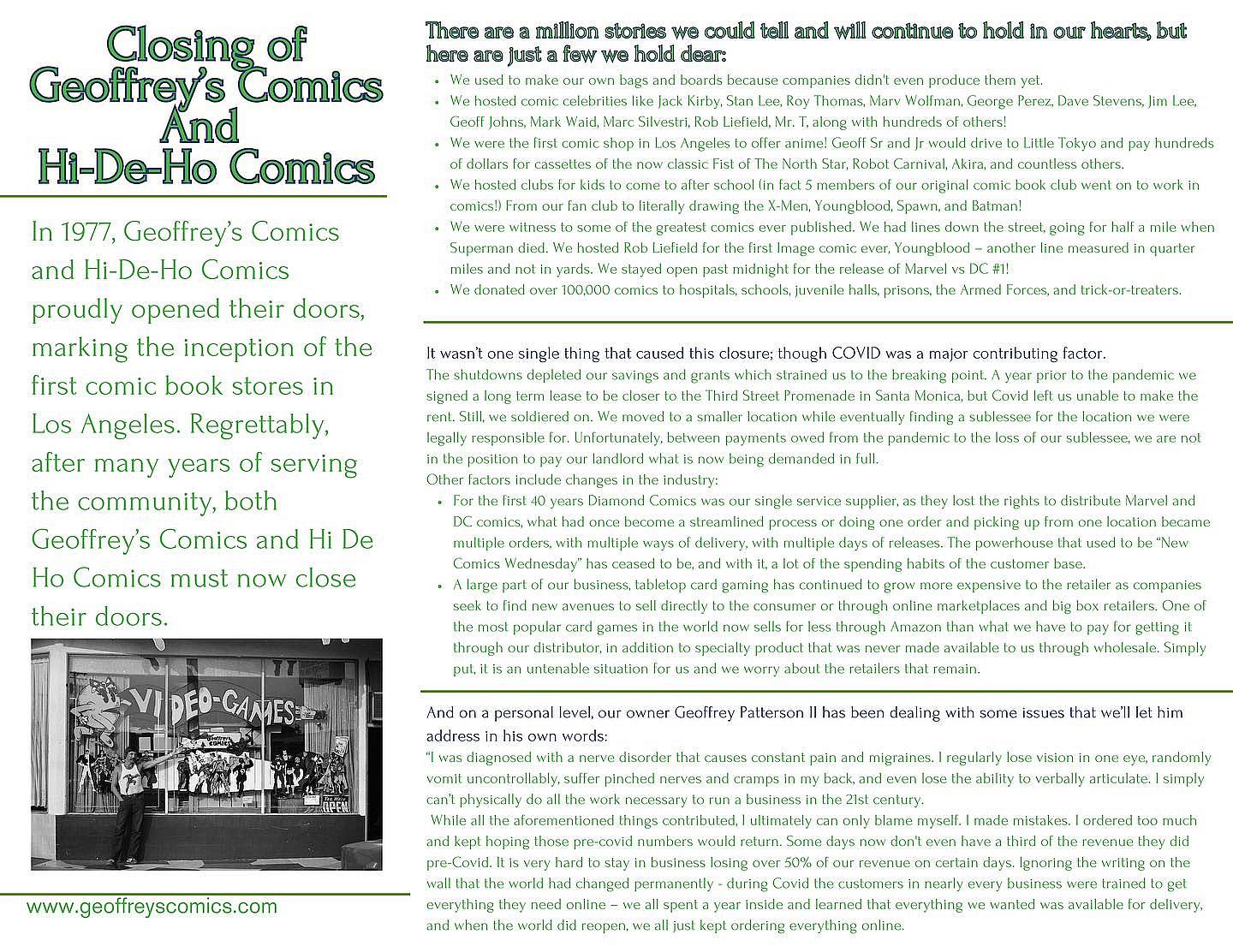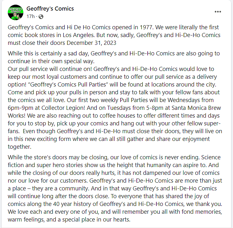 In a post to Facebook, Geoffrey’s Comics announced, “Geoffrey’s Comics and Hi De Ho Comics opened in 1977. We were literally the first comic book stores in Los Angeles. But now, sadly, Geoffrey’s and Hi-De-Ho Comics must close their doors December 31, 2023.”