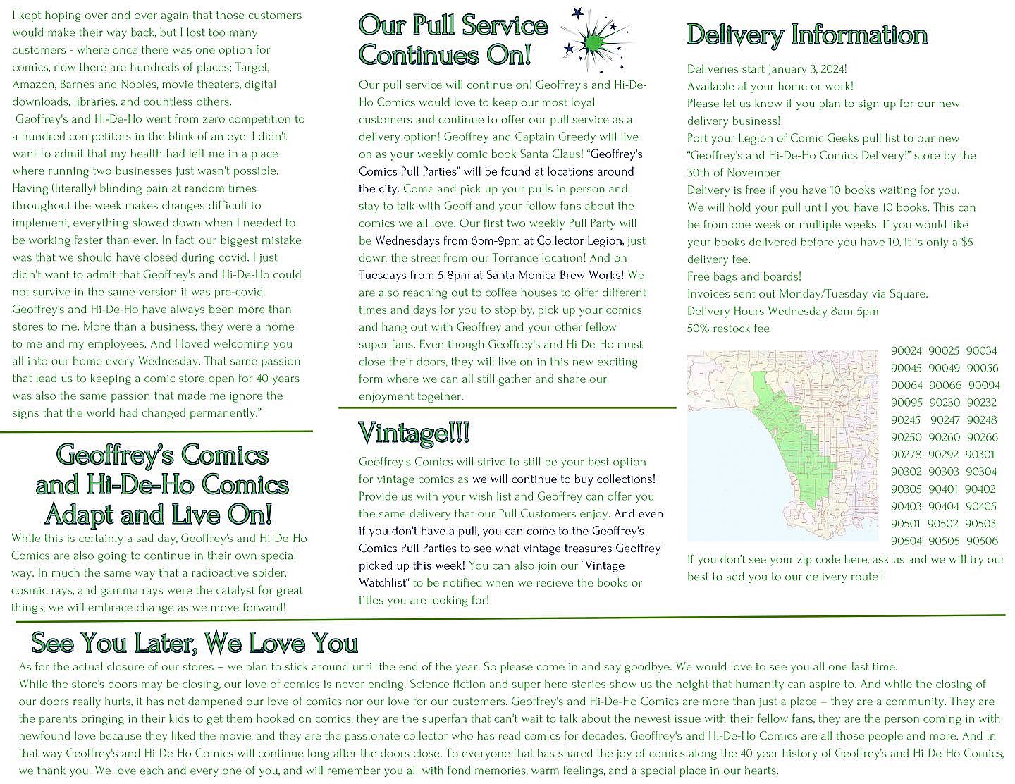 Geoffrey’s Comics and Hi-De-Ho Comics will remain open until the end of the year when they will officially shutter. As noted above the business will attempt to transition into a delivery business with offerings to places of business as well as residential. Delivery is free if one has more than 10 books to be delivered. “We will hold your pull until you have 10 books. This can be from one week or multiple weeks,” the shop explains.
