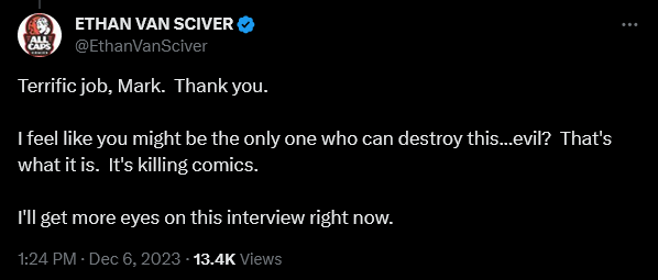 Among those who commented on the discussion was Cyberfrog creator Ethan Van Sciver, who praised his industry colleague, “Terrific job, Mark. Thank you.”