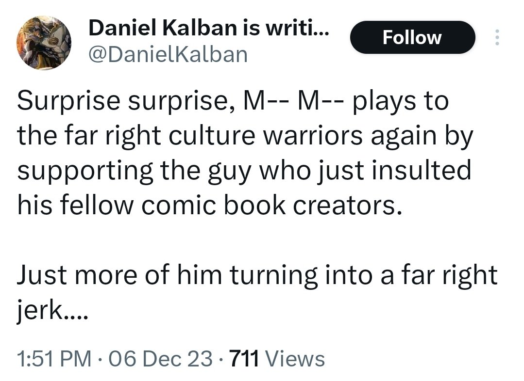Daniel Kalban, the writer of Band of Bards’ American Dreams, likewise decried, “Surprise surprise, M– M– plays to the far right culture warriors again by supporting the guy who just insulted his fellow comic book creators. Just more of him turning into a far right jerk….”