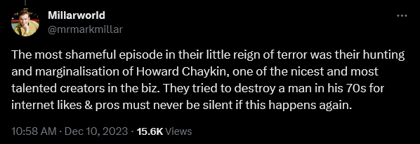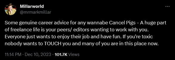 A few short hours later, Millar would also assure a fan that despite their bleating and screeching, said cancel pigs ultimately held zero sway over the industry.
