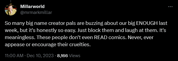 Referring to the aforementioned O’Leary’s viral push back against the industry, Millar then declared, “So many big name creator pals are buzzing about our big ENOUGH last week, but it’s honestly so easy. Just block them and laugh at them. It’s meaningless. These people don’t even READ comics. Never, ever appease or encourage their cruelties.”