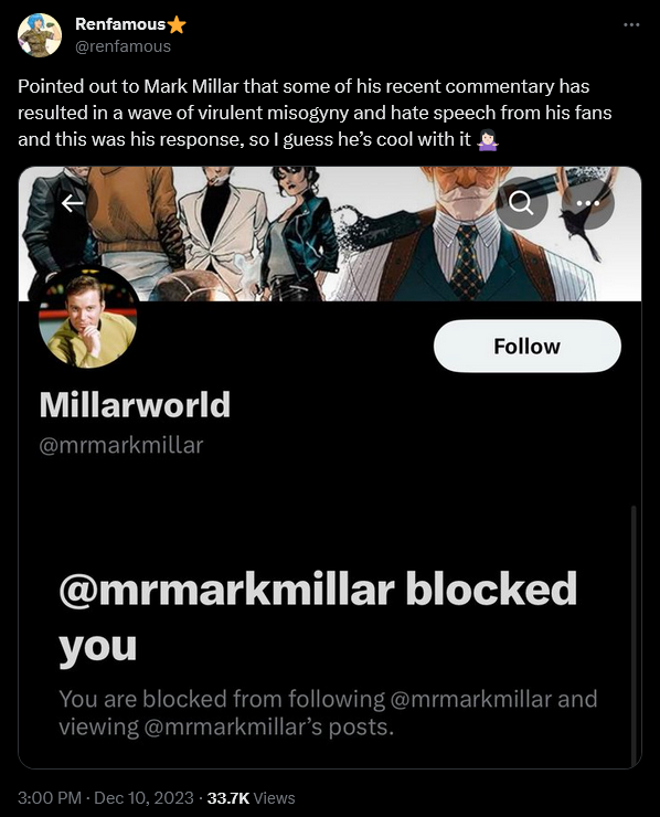 Met with a block from Millar a few days later, Cooper accused in turn, “Pointed out to Mark Millar that some of his recent commentary has resulted in a wave of virulent misogyny and hate speech from his fans and this was his response, so I guess he’s cool with it”.