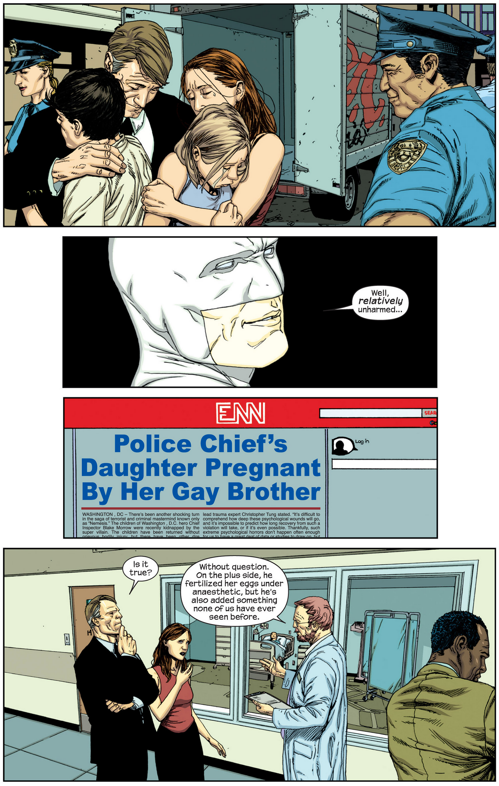 Pulling up a tweet from @UpToTask regarding the plot of Nemesis Vol. 1, Perch quoted, “Are y’all REALLY surprised about Mark Millar? This the same guy who wrote a story where a supervillain kidnaps a cop’s kids, threaten to reveal to the world the son was gay and the daughter had an abortion then injects sperm from the gay brother into the daughter to impregnate her”.