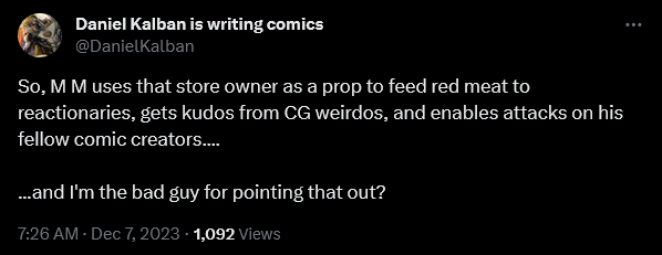 In a follow-up tweet, Kalban further steamed, “So, M M uses that store owner as a prop to feed red meat to reactionaries, gets kudos from CG weirdos, and enables attacks on his fellow comic creators…and I’m the bad guy for pointing that out?”