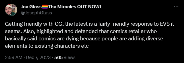 Replying to a tweet from @DarickR asking “Why exactly are people on here slagging Mark Millar”, QueerComix’s The Pride writer Joe Glass claimed, “Getting friendly with [ComicsGate], the latest is a fairly friendly response to EVS it seems.”