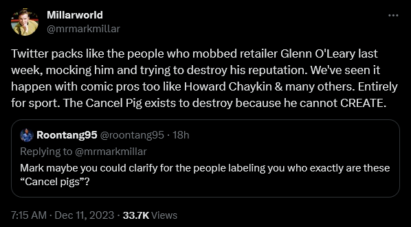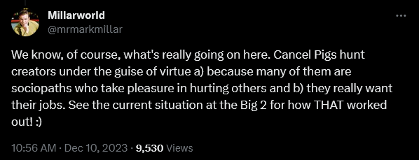 Mark Millar Takes A Stand Against “Cancel Pigs”, Calls On Creators And Fans To “Never, Ever Appease Or Encourage Their Cruelties”