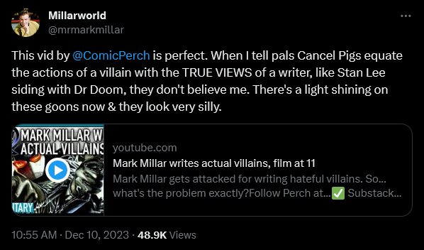 Sharing Perch’s work to his personal Twitter account shortly after its publication, Millar declared, “This vid by @ComicPerch is perfect. When I tell pals Cancel Pigs equate the actions of a villain with the TRUE VIEWS of a writer, like Stan Lee siding with Dr Doom, they don’t believe me. There’s a light shining on these goons now & they look very silly.”