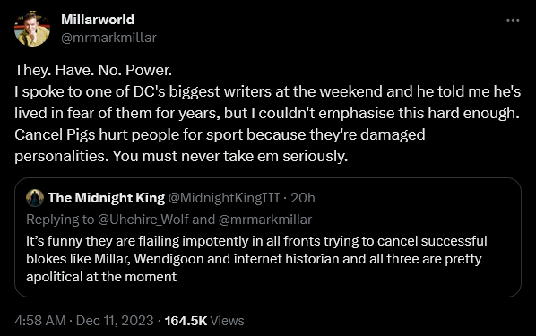 Retweeting @MidnightKingIII’s observation that It’s funny they are flailing impotently in all fronts trying to cancel successful blokes like Millar, [YouTuber] Wendigoon and [YouTuber] Internet Historian and all three are pretty apolitical at the moment,” The Flash Vol. 2 author adamantly declared, “They. Have. No. Power.”