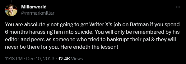 “You are absolutely not going to get Writer X’s job on Batman if you spend 6 months harassing him into suicide,” he then made clear. “You will only be remembered by his editor and peers as someone who tried to bankrupt their pal & they will never be there for you. Here endeth the lesson!”