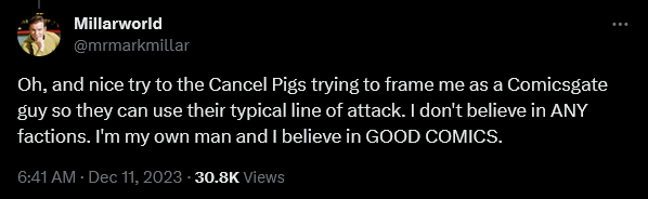 After spending the next few hours thereafter being inundated with insults and attacks from the very bloodthirsty fans he called out, Millar once again addressed his detractors, this time informing them, “Nice try to the Cancel Pigs trying to frame me as a Comicsgate guy so they can use their typical line of attack. I don’t believe in ANY factions. I’m my own man and I believe in GOOD COMICS.”