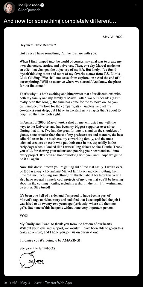 Quesada revealed his then-upcoming exit from Marvel on May 31st, publishing a lengthy statement to his Twitter and Facebook accounts asking, “Hey there, True Believer! Got a sec? I have something I’d like to share with you.”