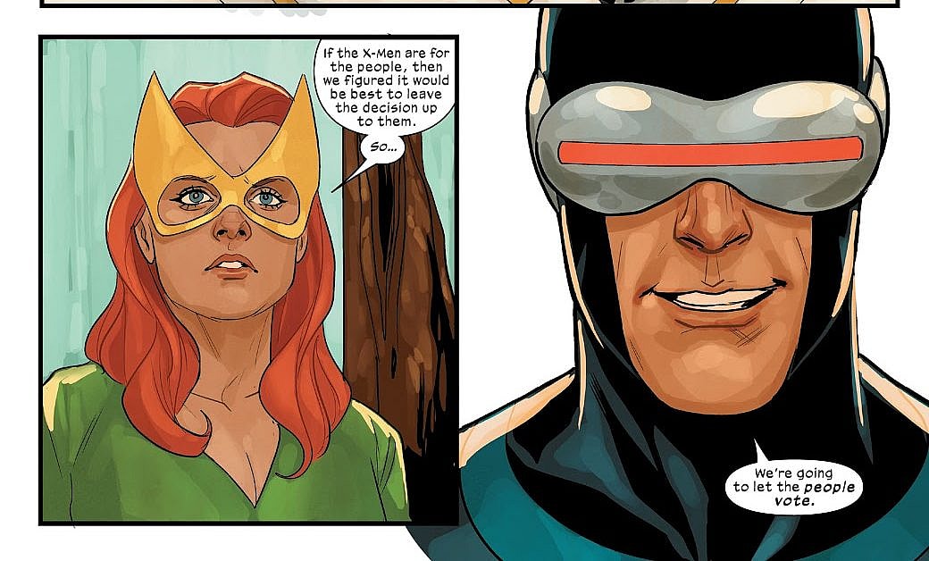 Jean states, “If the X-Men are for the people, then we figured it would be best to leave the decision up to them. So…”