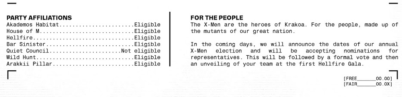 X-Men #16 concludes by stating, “The X-Men are the heroes of Krakoa. For the people, made up of the mutants of our great nation. In the coming days, we will announce the dates of our annual X-Men election and will be accepting nominations for representatives. This will be followed by a formal vote and then an unveiling of your team at the first Hellfire Gala.”