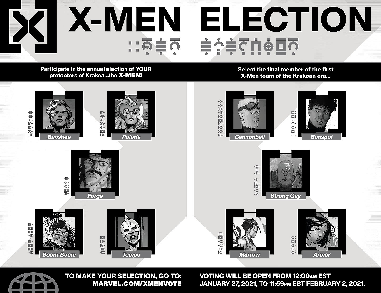 A post to the official Marvel website declares, “The first-ever X-Men election is here! Starting tomorrow until February 2, fans can vote at Marvel.com/xmenvote to determine the final member of the first X-Men team of the Krakoan era – and one of the most iconic teams in the Marvel Universe.”
