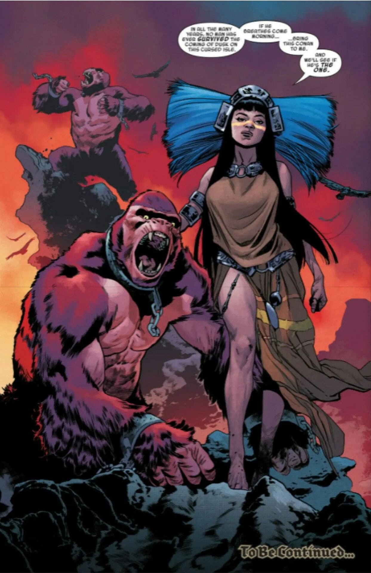 Introduced by Aaron and artist Mahmud Asrar in February 16th’s King Conan Vol. 2 #2, the controversial character in question first made herself known to readers on the final page of the issue, watching the titular barbarian from a mountain top as she finds herself intrigued by the possibility that he may survive a night amongst the undead legions that inhabit her island home, the Golden Ruin.