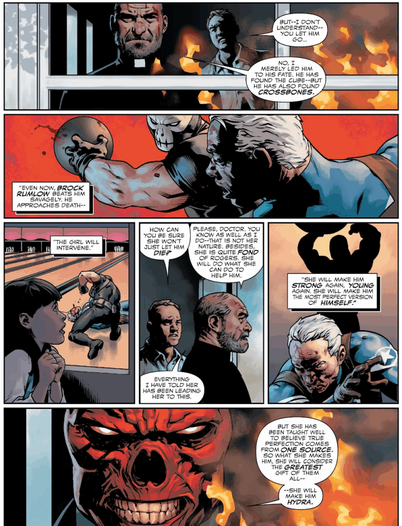 These developments eventually culminated in the infamous moment in 2016’s Captain America: Steve Rogers Vol. 1 #1 when, after finding his plan to ‘fake’ the saving of Dr. Erik Selvig from Baron Zemo as a cover to assassinate him on behalf of the Red Skull suddenly interrupted by the on-scene arrival of fellow America-themed super hero Jack Flag, Steve proceeds to throw him out of an airplane’s cargo hold before assuring said scientist of his allegiances with a confident declaration of, “Hail Hydra.”
