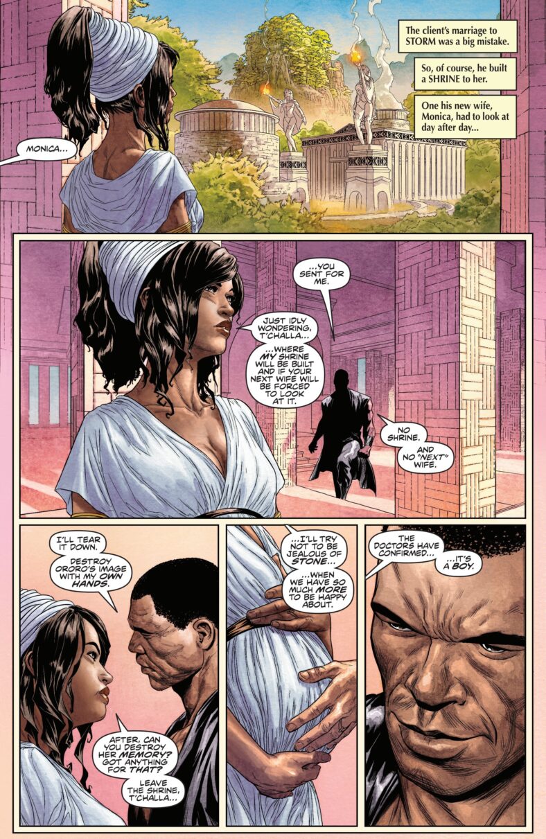 Notably, the issue reveals that at some point following his divorce from X-Men mainstay Storm, T’Challa reunited with his first fiancé, Monica Lynne, and the two eventually became pregnant.