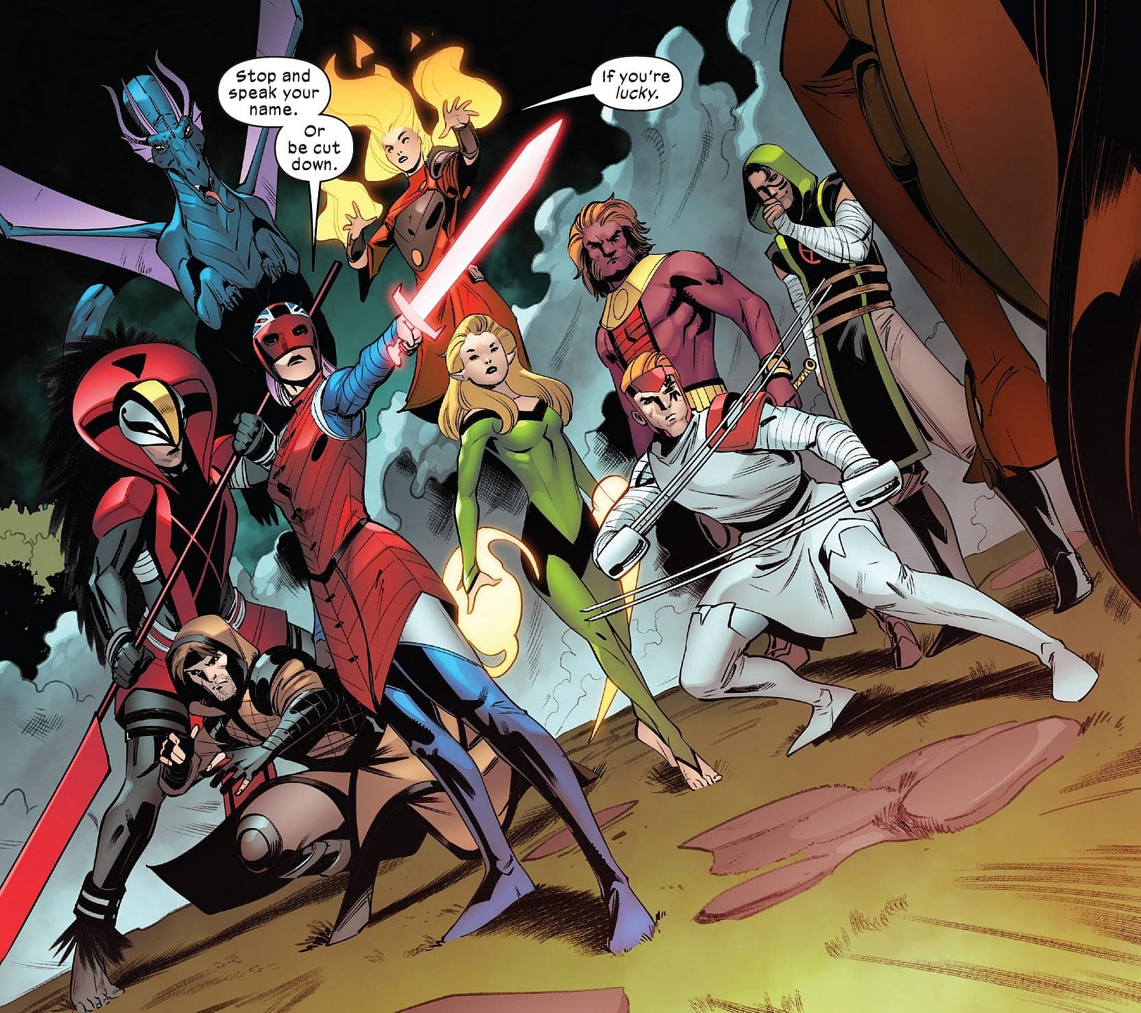 Following Gambit’s death at the hands of Merlyn at the conclusion of the previous issue, Knights of X #4 finds the team retreating from the fight to the Mercator, where the Siege Perilous has become the land itself and forces them to face their innermost selves, in order to escape the wizard and regroup.