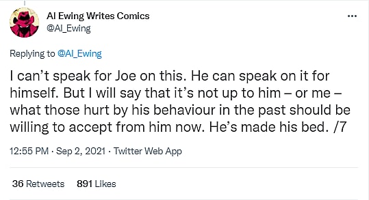 The Immortal Hulk artist added, “I can’t speak for Joe on this. He can speak on it for himself. But I will say that it’s not up to him – or me – what those hurt by his behaviour in the past should be willing to accept from him now. He’s made his bed.”