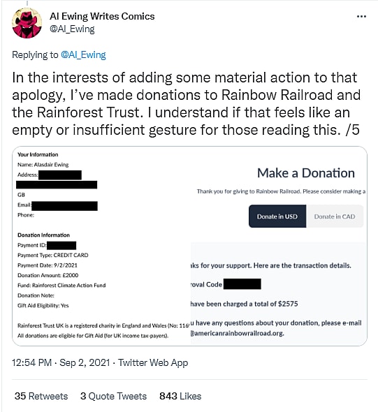 “In the interests of adding some material action to that apology, I’ve made donations to Rainbow Railroad and the Rainforest Trust. I understand if that feels like an empty or insufficient gesture for those reading this,” he stated.