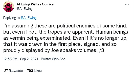 He tweeted, “There’s an image doing the rounds that Joe Bennett drew back in 2017. I won’t link to it, but I have seen it, and it’s reprehensible. Thread follows.”