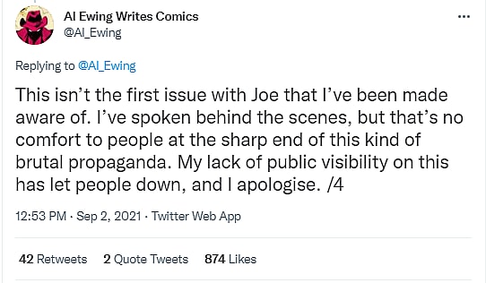 Ewing then tweeted, “This isn’t the first issue with Joe that I’ve been made aware of. I’ve spoken behind the scenes, but that’s no comfort to people at the sharp end of this kind of brutal propaganda. My lack of public visibility on this has let people down, and I apologise.”