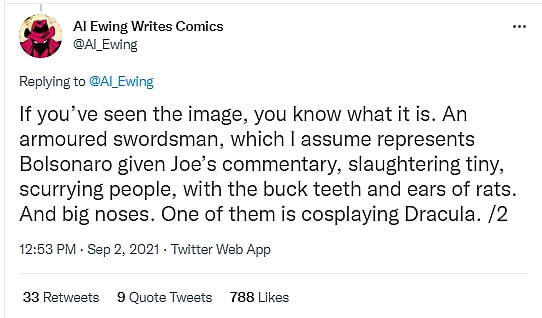 He next wrote, “If you’ve seen the image, you know what it is. An armoured swordsman, which I assume represents Bolsonaro given Joe’s commentary, slaughtering tiny, scurrying people, with the buck teeth and ears of rats. And big noses. One of them is cosplaying Dracula.”