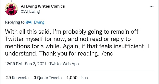 “With all this said, I’m probably going to remain off Twitter myself for now, and not read or reply to mentions for a while. Again, if that feels insufficient, I understand. Thank you for reading,” he concluded.