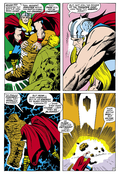 Thor would eventually gain the upper hand on Warlock by tapping into Warrior Madness. The increased fury would force Warlock to return to his cocoon and shoot off into space leaving Sif behind.