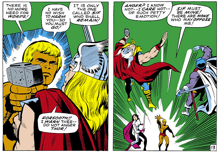 Upon awaking on earth, Warlock encounters Thor, Sif, and Baldr. He notes that he is lonely and wishes to find a mate and chooses Sif. A battle breaks out when Warlock sends both Thor and Baldr flying while declaring, “Sif must be mine! There are none who oppose me!”