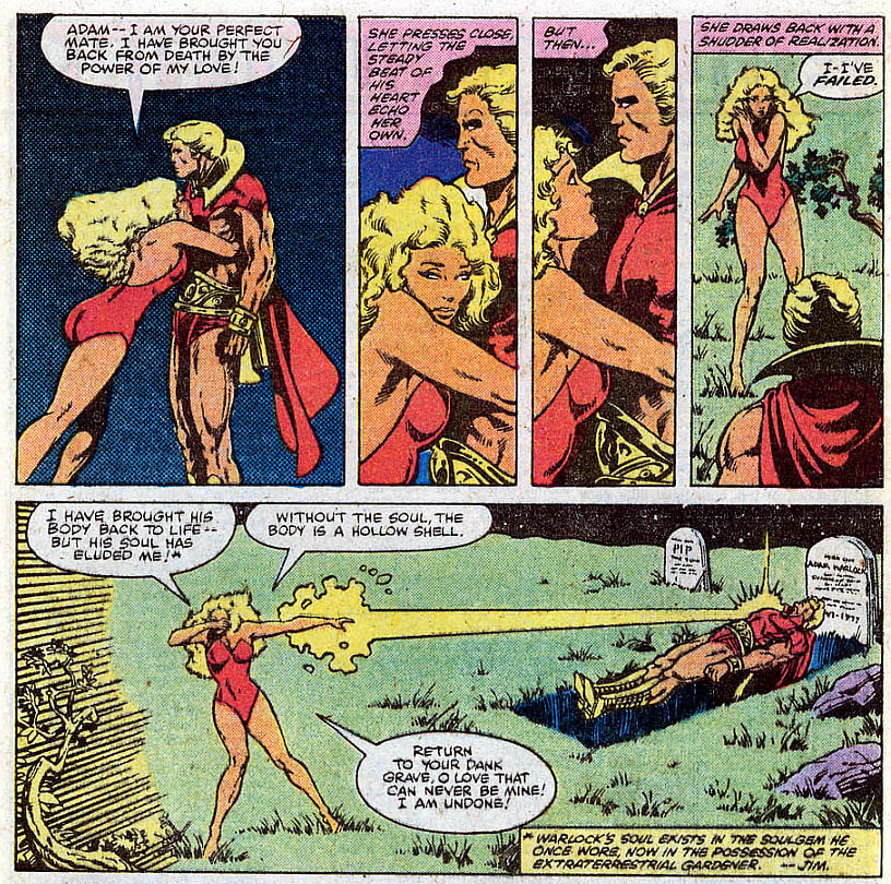 Her would eventually travel with Moondragon, Alicia Masters, and Ben Grimm to Counter-Earth where she discovers the grave of Adam Warlock, using her abilities she’s able to resurrect Warlock’s physical form, but fails to have returned his soul to his body.