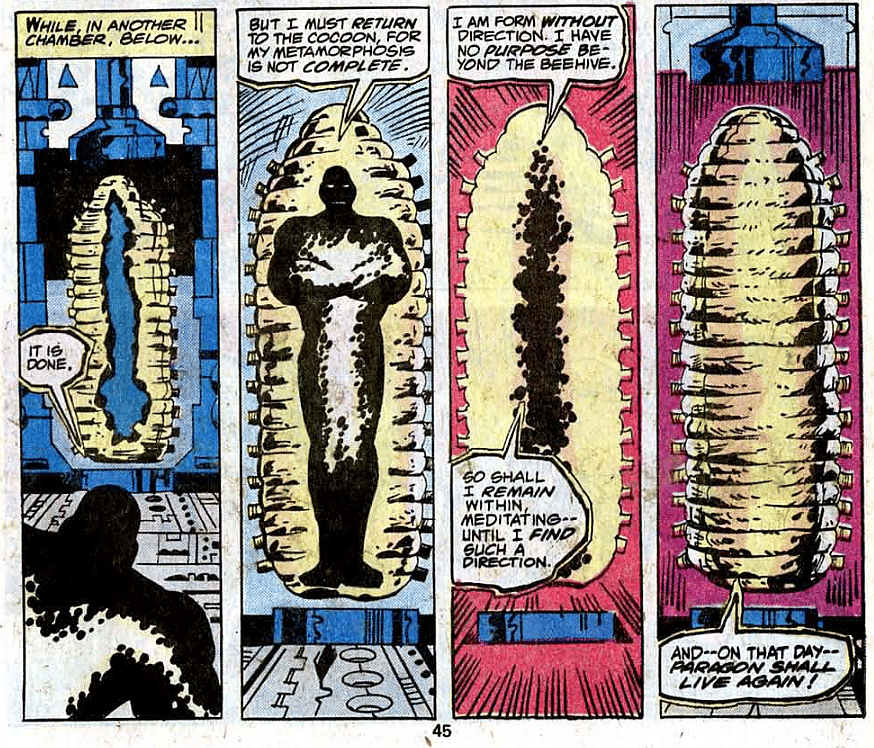 After an epic battle with Doctor Strange and the Hulk, who was on the hunt for Doctor Strange, Paragon reveals he had previously learned about Warlock and knew of the scientists evil intentions. He found a way to subvert their control mechanisms and transform into an energy being. He then proceeds to destroy the base known as the Beehive before retreating back to his cocoon.