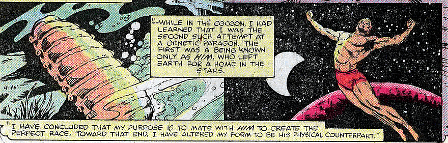 The cocoon would eventually be discovered in New York City and dragged out of the water. Upon being dragged out of the water an energy being bursts forth and proceeds to locate The Thing and Alicia Masters.