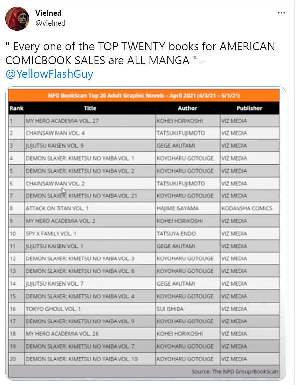 Twitter user Vielned points out that the latest NPD BookScan results for April 2021 show manga dominating sales with the top 20 slots. There are no western comics on the list whatsoever.