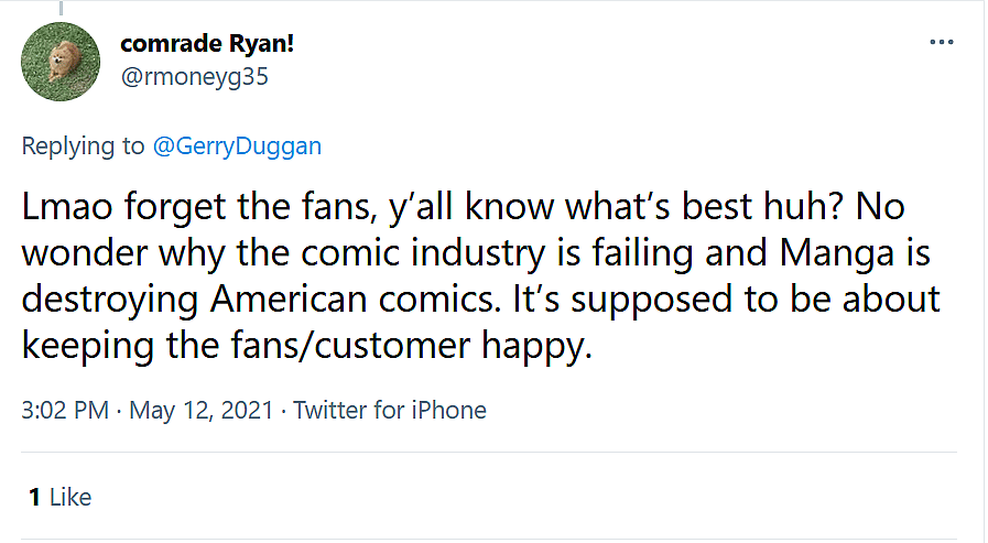 The user added, “No wonder why the comic industry is failing and Manga is destroying American comics. It’s supposed to be about keeping the fans/customer happy.”