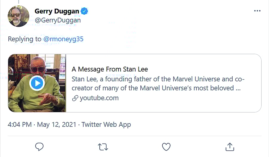 Duggan responded by sharing a YouTube video from Marvel Entertainment with a message from Stan Lee.