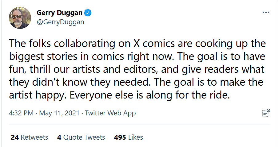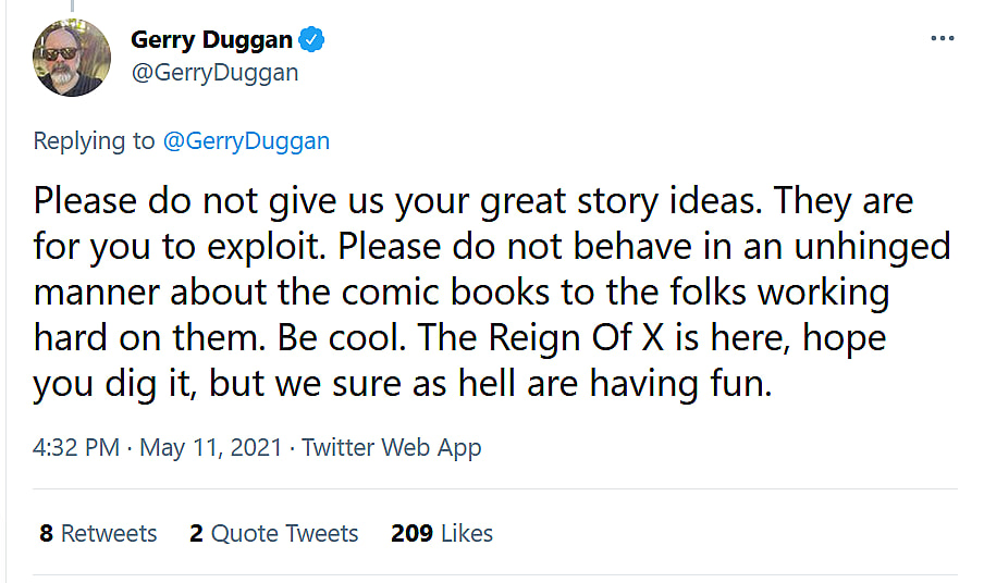 Duggan took to Twitter, where he wrote, “The folks collaborating on X comics are cooking up the biggest stories in comics right now.”