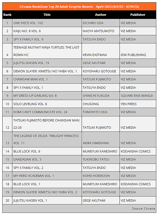 ICv2’s April 2023 Top 20 Adult Graphic novel list only has one western published title on the list that being Teenage Mutant Ninja Turtles: The Last Ronin HC. Every other title is either a manga or a manwha with One Piece Vol. 102, Kaiju No. 8 Vol. 6, and Spy X Family Vol. 9 taking the top three spots.