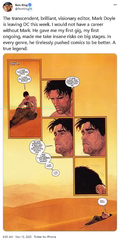 “The transcendent, brilliant, visionary editor, Mark Doyle is leaving DC this week,” said King on Twitter, alongside a page from his Batman run, edited by Doyle. “I would not have a career without Mark. He gave me my first gig, my first ongoing, made me take insane risks on big stages. In every genre, he tirelessly pushed comics to be better. A true legend.”