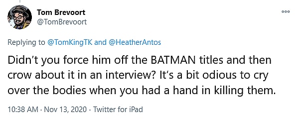 King’s tweet would then prompt a response from Brevoort, who asked the infamous Batman writer, “Didn’t you force him off the BATMAN titles and then crow about it in an interview?”