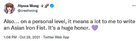 “Also…on a personal level, it means a lot to me to write an Asian Iron Fist,” said Wong. “It’s a huge honor.”