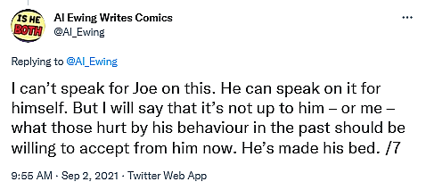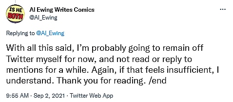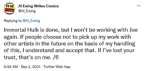 Turning to the subject of his working relationship with Bennett, Ewing asserted, “Immortal Hulk is done, but I won’t be working with Joe again. If people choose not to pick up my work with other artists in the future on the basis of my handling of this, I understand and accept that. If I’ve lost your trust, that’s on me.”