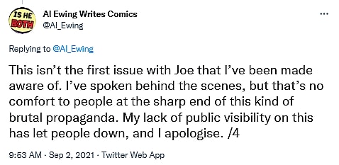 Ewing further noted that “This isn’t the first issue with Joe that I’ve been made aware of. I’ve spoken behind the scenes, but that’s no comfort to people at the sharp end of this kind of brutal propaganda. My lack of public visibility on this has let people down, and I apologise.”