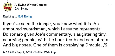 “If you’ve seen the image, you know what it is,” explained Ewing. “An armoured swordsman, which I assume represents Bolsonaro given Joe’s commentary, slaughtering tiny, scurrying people, with the buck teeth and ears of rats. And big noses. One of them is cosplaying Dracula.”