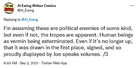 “I’m assuming these are political enemies of some kind, but even if not, the tropes are apparent,” he continued. “Human beings as vermin being exterminated. Even if it’s no longer up, that it was drawn in the first place, signed, and so proudly displayed by Joe speaks volumes.”
